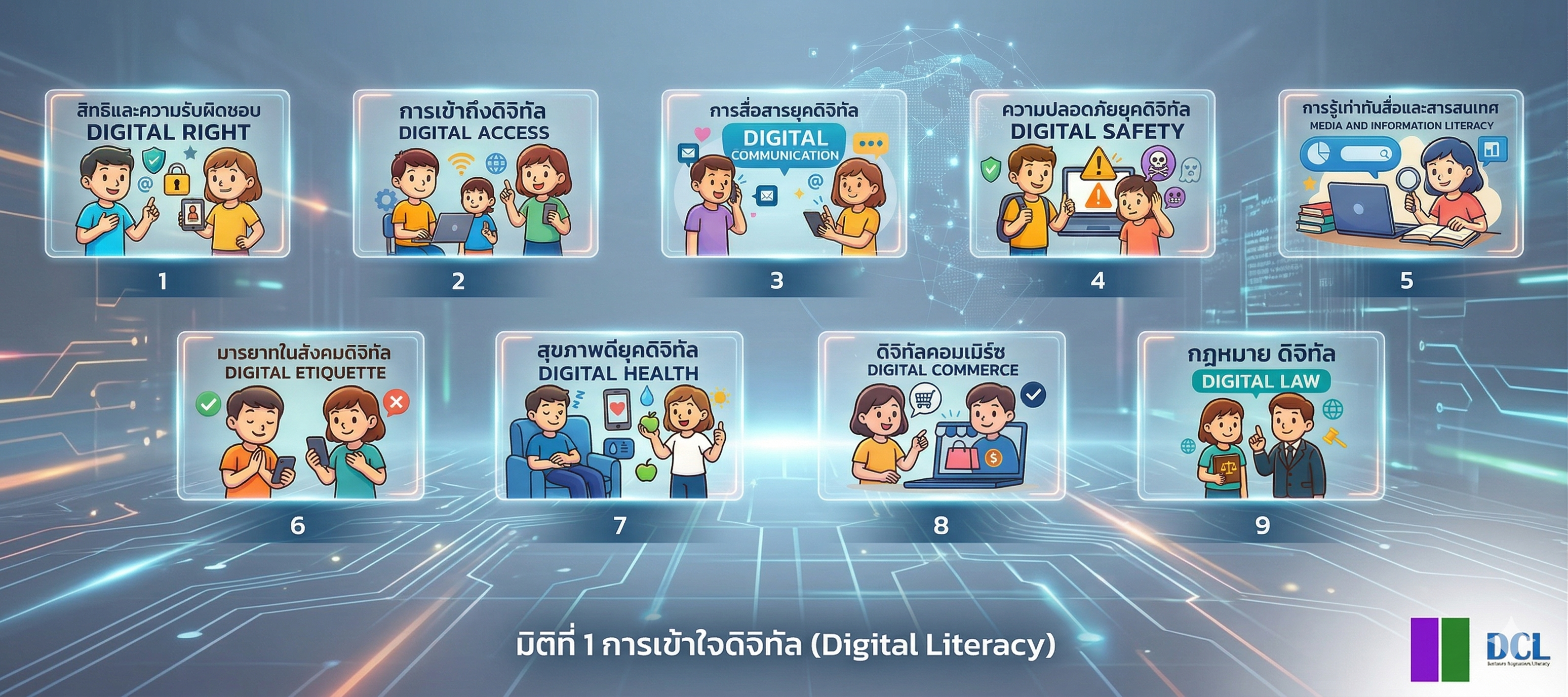 9. กฎหมายดิจิทัล (Digital Law) คือ การที่บุคคลสามารถที่จะเข้าใจสิทธิและข้อจำกัดที่ควบคุมการใช้สื่อดิจิทัลในรูปแบบต่าง ๆ ซึ่งได้ถูกกำหนด โดยภาครัฐ เพื่อให้สามารถปฏิบัติงานและดำเนินชีวิตได้อย่างถูกต้องตามกฎระเบียบทางสังคม ซึ่งเป็นการเคารพสิทธิของผู้อื่นอีกด้วยและรวมไปถึงเรียนรู้กฎหมายที่เกี่ยวข้องกับทรัพย์สินทางปัญญา และกฎหมายที่เกี่ยวข้องกับเศรษฐกิจดิจิทัล เพื่อให้ระบุได้ว่าการกระทำใดเป็นความผิดที่เกี่ยวกับกฎหมายดิจิทัล ทราบถึงโทษของการกระทำความผิด มีแนวทางป้องกันการกระทำความผิดที่เกี่ยวกับกฎหมายดิจิทัล